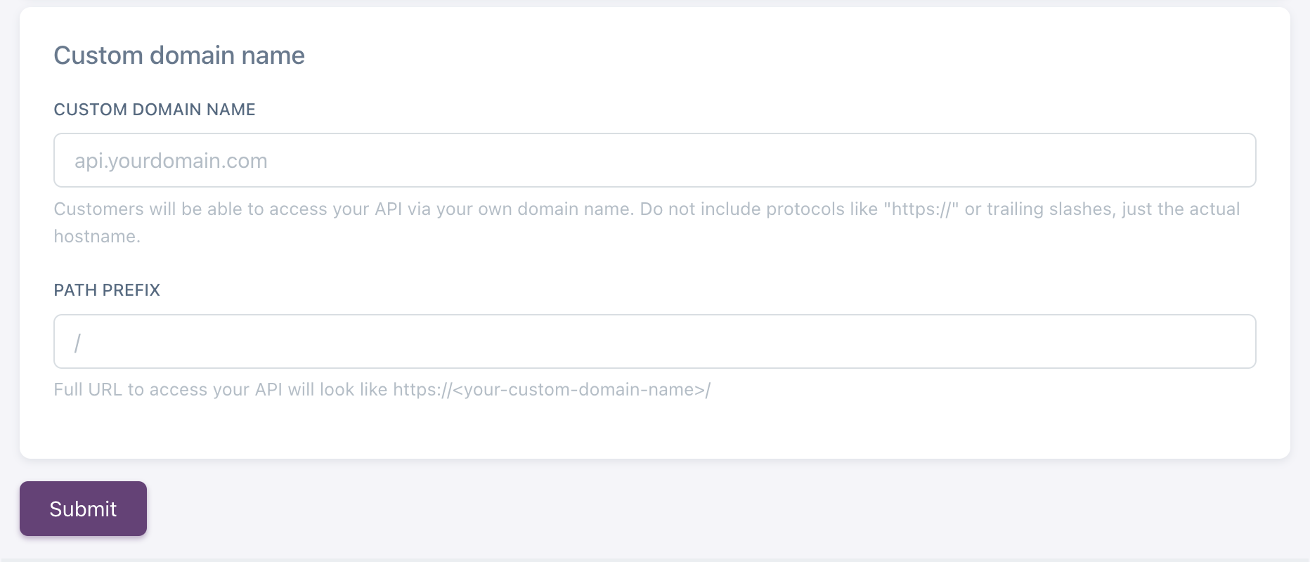 To start, navigate to My APIs → choose API → Settings. Scroll the page down to the Custom domain name section.