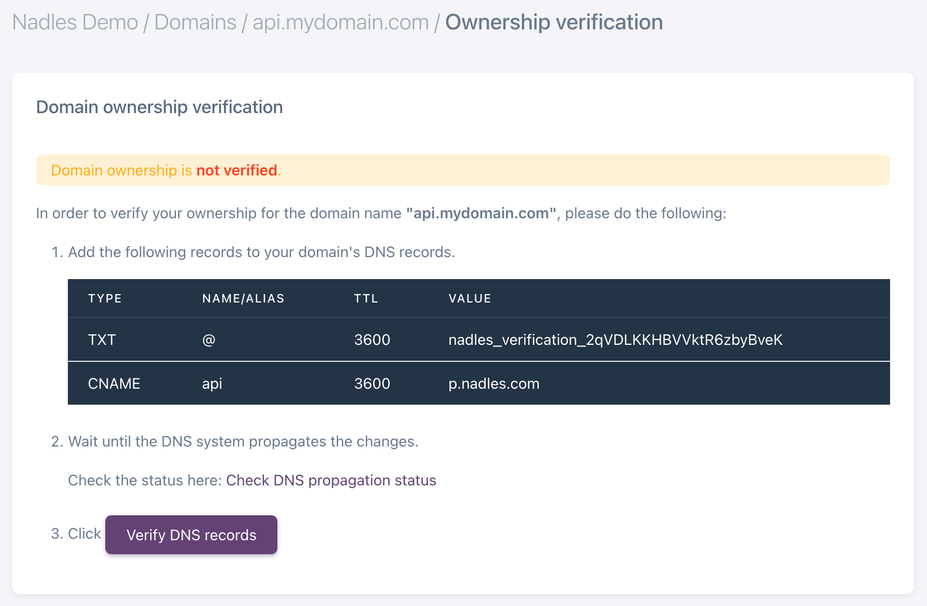 - TXT record for the base domain with a unique value generated by Nadles.