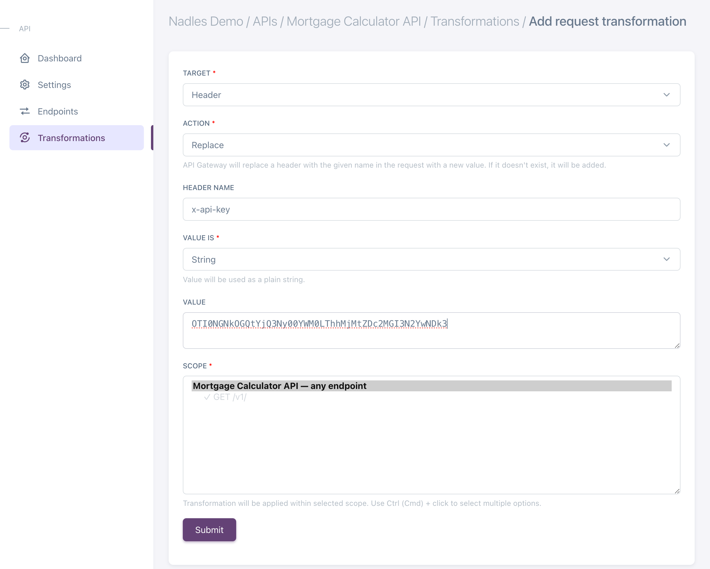That’s it: Nadles will now add header X-Api-Key: <value> to each request.