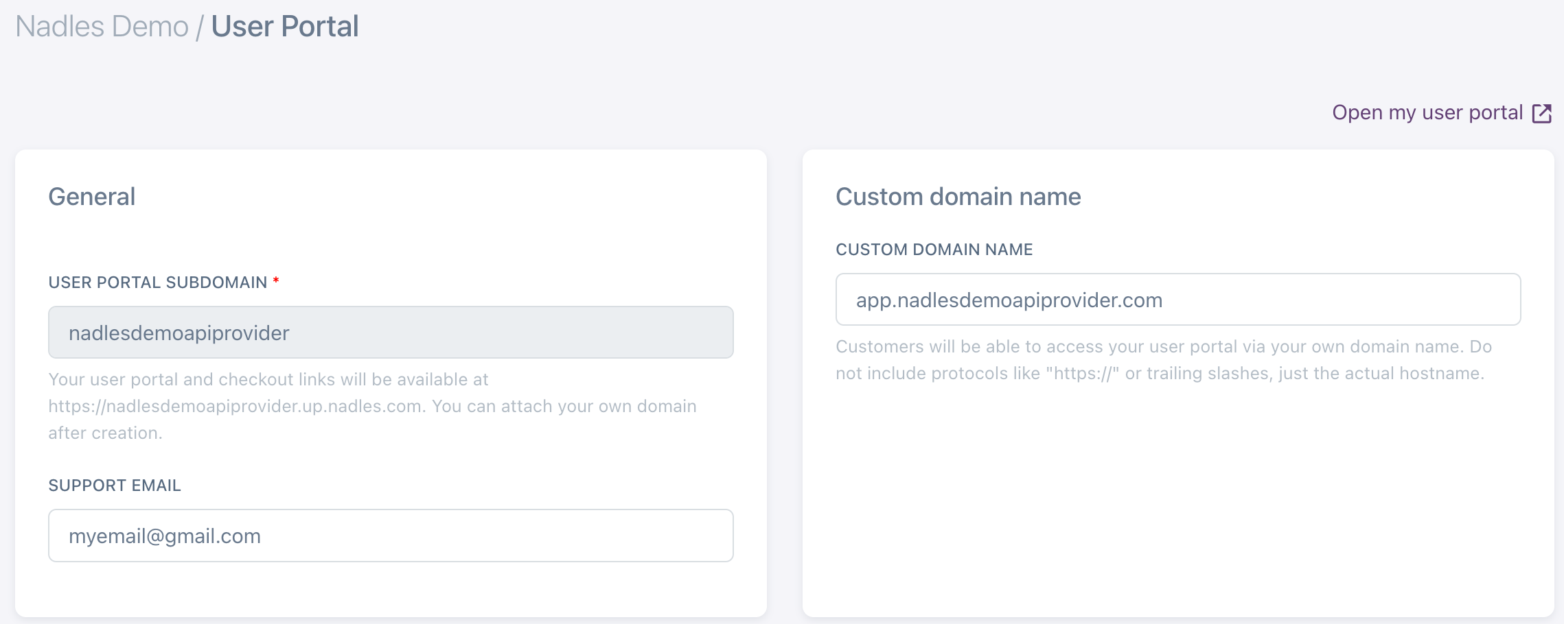 You can attach a custom domain name to your Nadles User Portal, so that, instead of Nadles domain (https://<subdomain>.up.nadles.com/), users access your portal by the domain name owned by you.