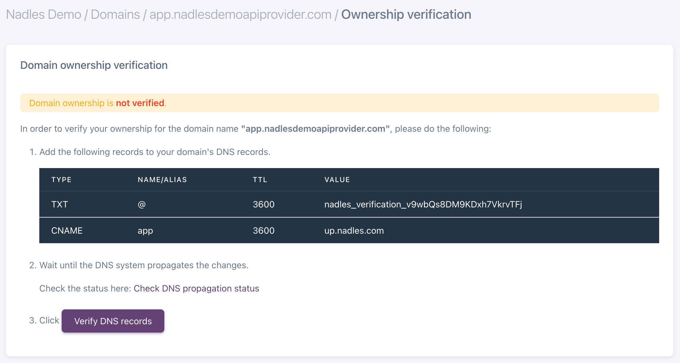 CNAME record for the desired subdomain referencing the Nadles domain name for user portals,